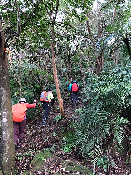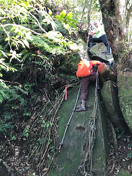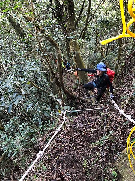 離開粽串尖後山路一路陡下,幾處岩壁地形,雖然有踩點,但是跨距較大,對女性而言還是有些困難。