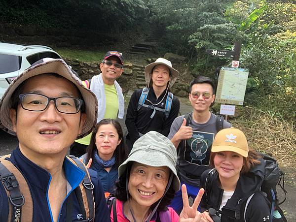 大坑山稜線步道登山口設有淡蘭古道指示牌,眾人在此先合影。