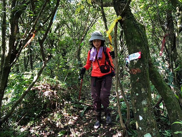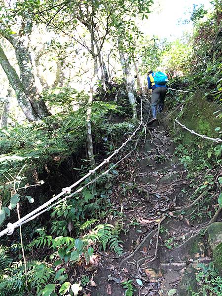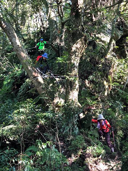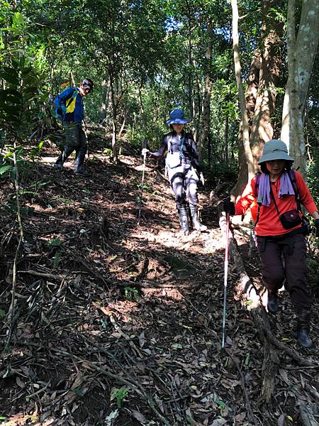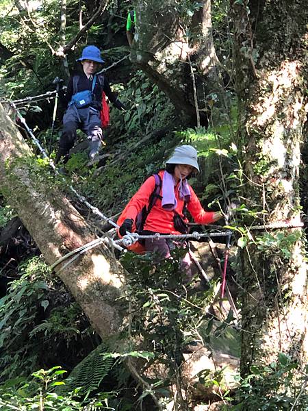 離開粽串尖後山路一路陡下,幾處岩壁地形,雖然有踩點,但是跨距較大,對女性而言還是有些困難。
